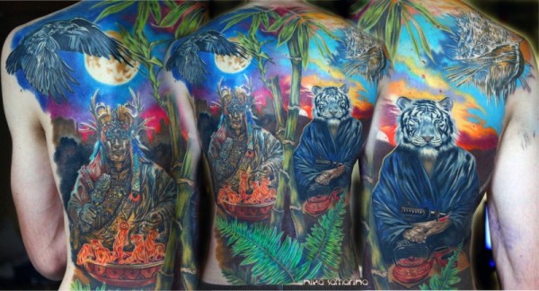 背部大型彩色幻想魔术师和白老虎纹身图案