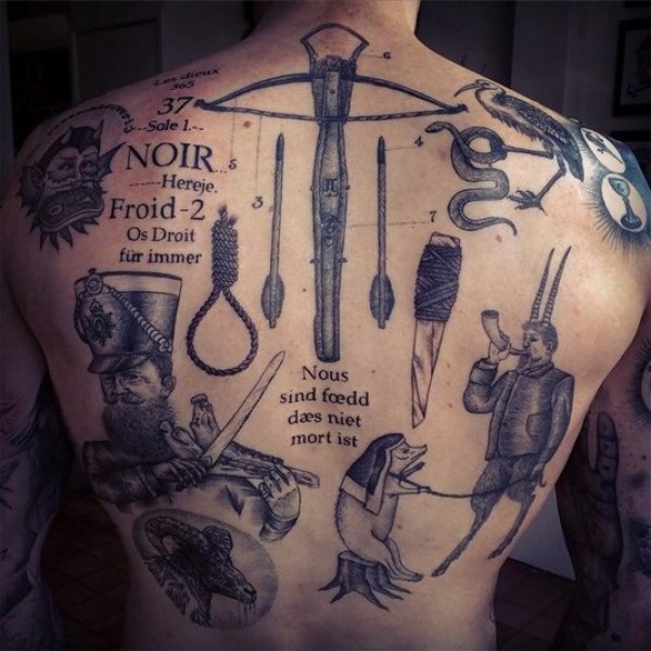 背部雕刻风格黑色的各种中世纪物品纹身图案