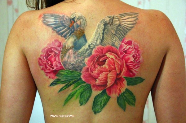 背部奇妙的彩色天鹅与鲜花和珠宝纹身图案