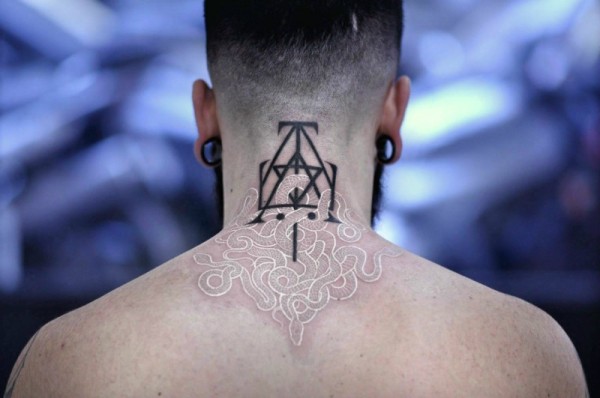 背部神奇的白色蛇与黑色符号纹身图案