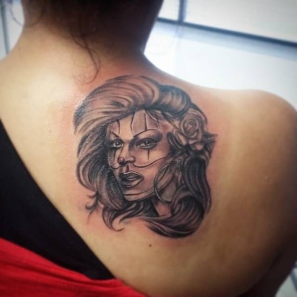 背部传统的黑色女子肖像纹身图案