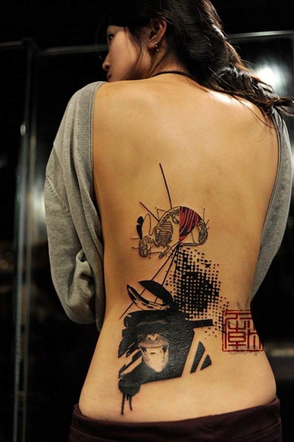 背部有趣的猴子和兔子黑色圆点纹身图案