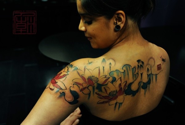 背部水彩风格彩色莲花和蜻蜓纹身图案
