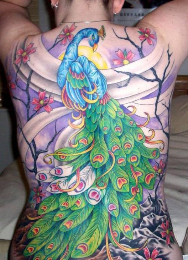 满背华丽的插画风格彩绘孔雀花朵纹身图案