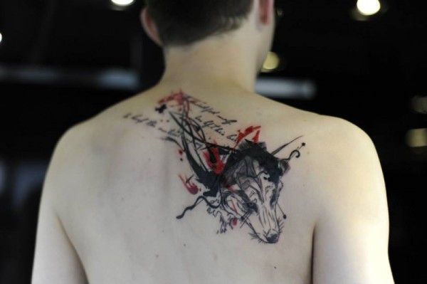 背部现代风格彩色的狼头泼墨纹身图案