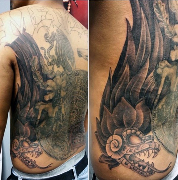 背部黑白的蛇与部落玛雅石雕纹身图案