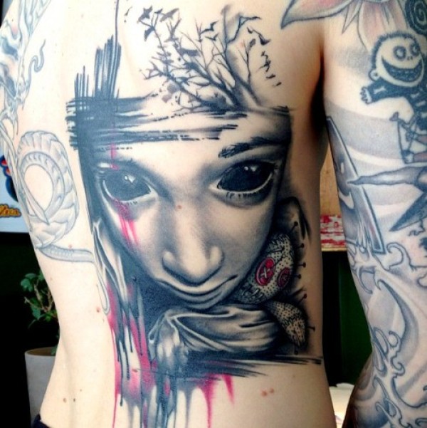背部可怕的神秘恐怖女孩肖像与巫毒娃娃纹身图案