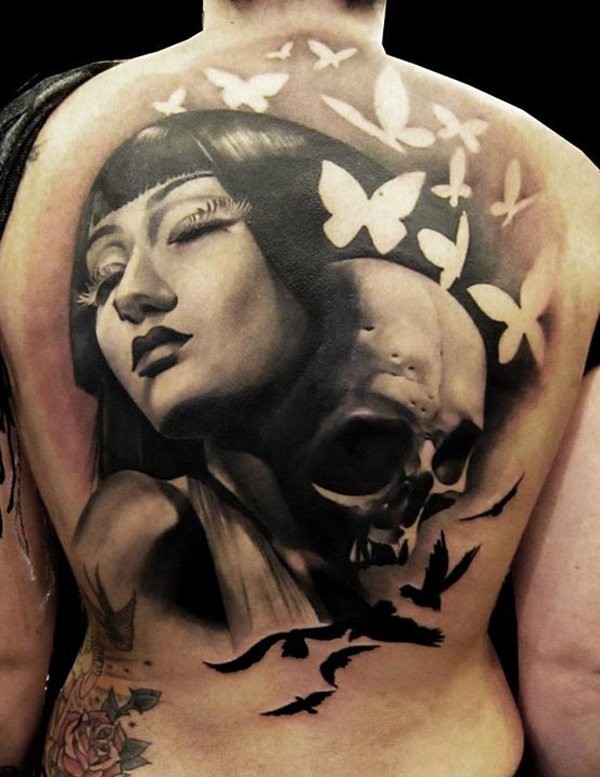 背部写实的惊人女人肖像骷髅和白蝴蝶纹身图案