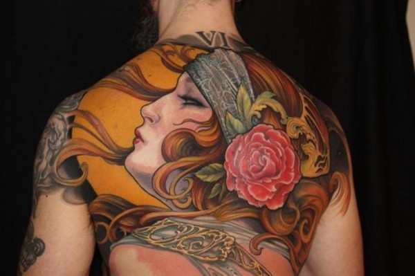 背部美丽的女人肖像与红玫瑰花纹身图案