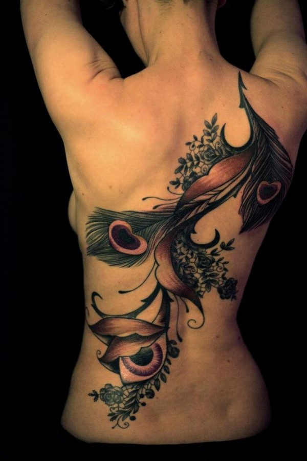 女生背部美丽的彩色孔雀羽毛花朵纹身图案