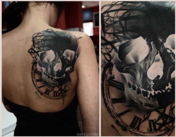 背部好看的黑色特殊骷髅与时钟纹身图案