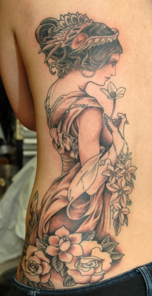 背部可爱的女人与鲜花和十字架纹身图案