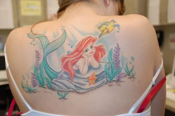 背部神奇的动画场景艾莉尔和比目鱼纹身图案