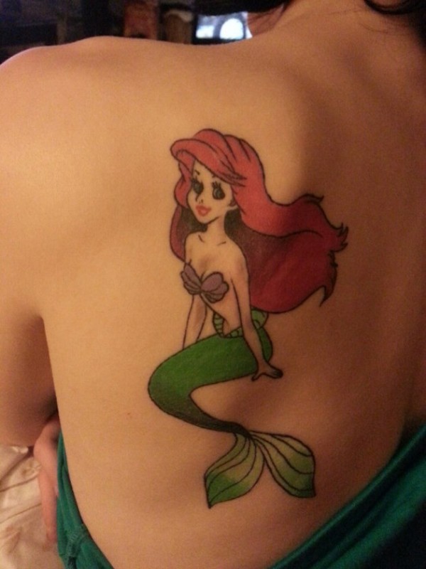 背部迷人的艾莉尔美人鱼传统彩色纹身图案