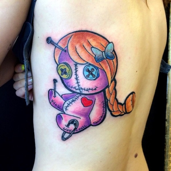 背部彩色的巫毒娃娃与心形纹身图案