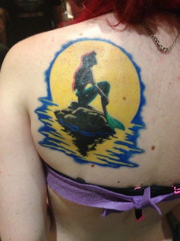 背部非常漂亮的彩色卡通美人鱼和月亮纹身图案