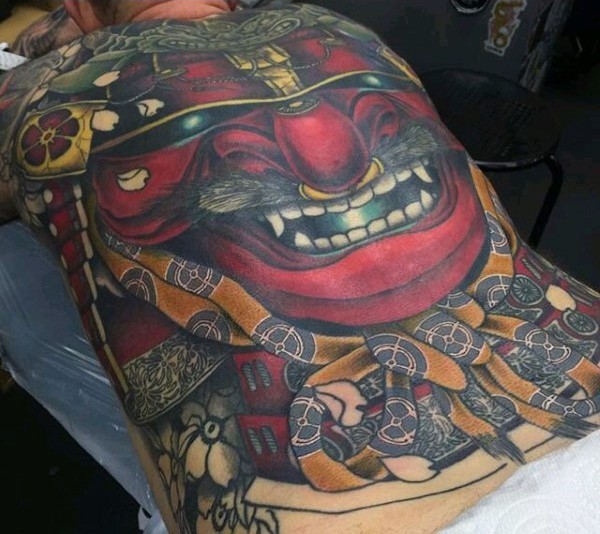 背部彩色精彩的武士面具纹身图案
