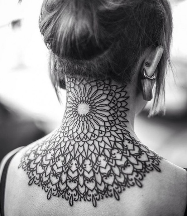 颈部和背部明亮的黑色巴洛克风格梵花纹身图案