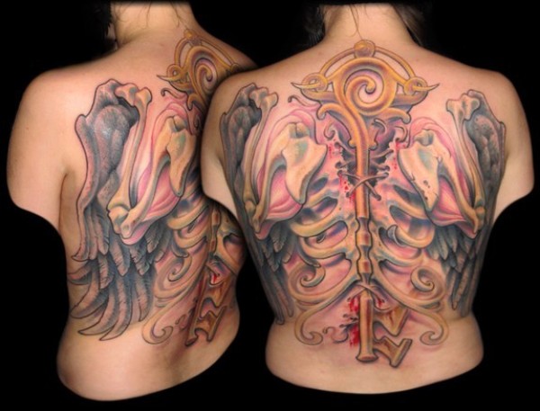 背部华丽的彩色奇特幻想翅膀纹身图案