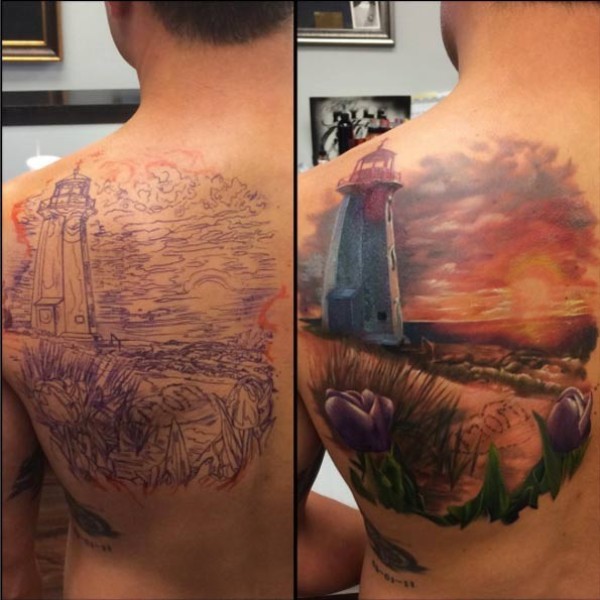 背部令人叹为观止的自然灯塔花朵纹身图案