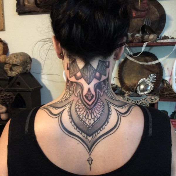颈部惊人的巴洛克风格点刺梵花纹身图案