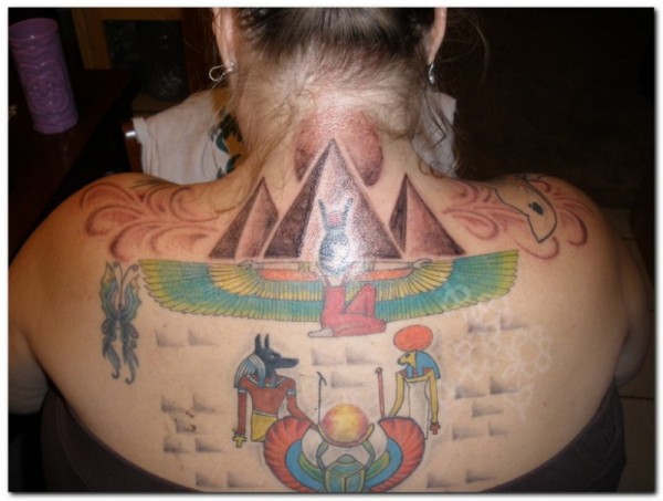 背部简单彩色的各种埃及符号标志纹身图案