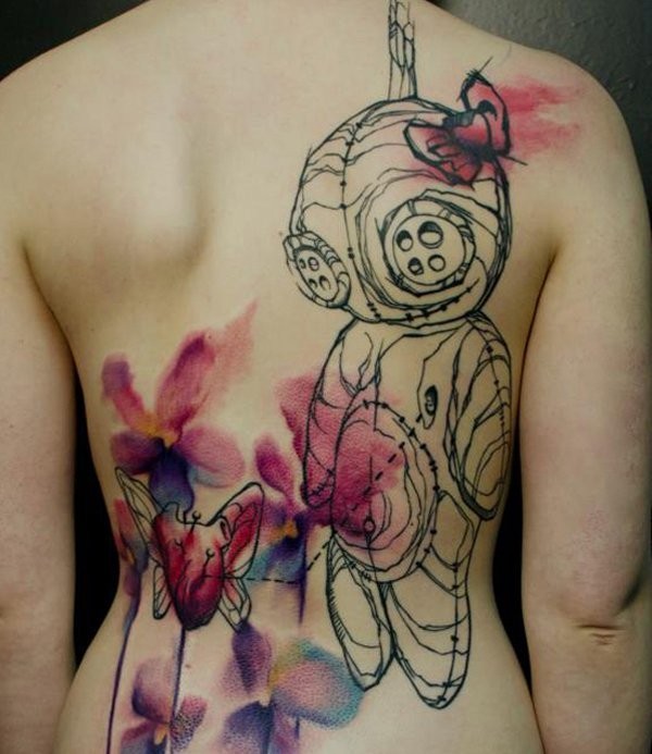 背部黑色线条恐怖玩偶和五彩花朵纹身图案