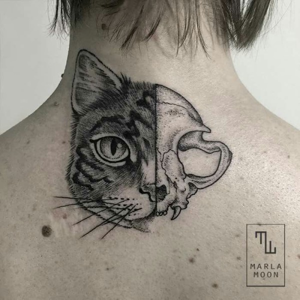 背部不寻常的黑色猫头半真实半骷髅纹身图案