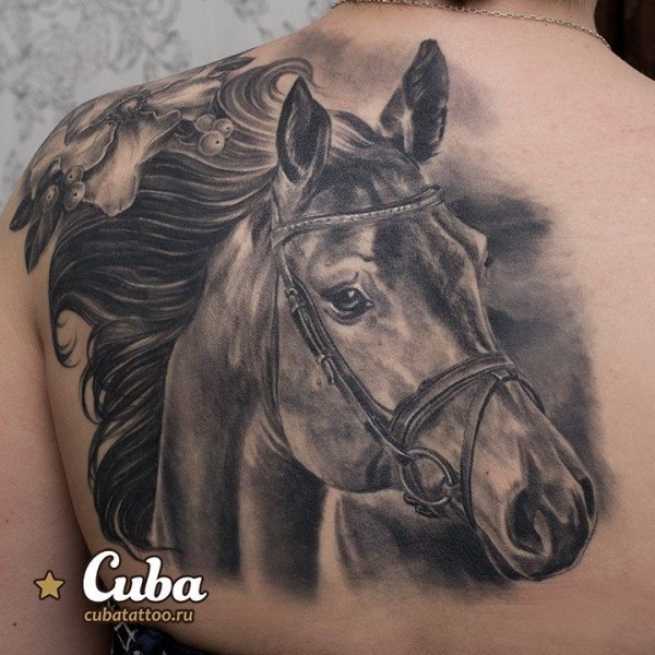 背部非常精致的黑白马纹身图案