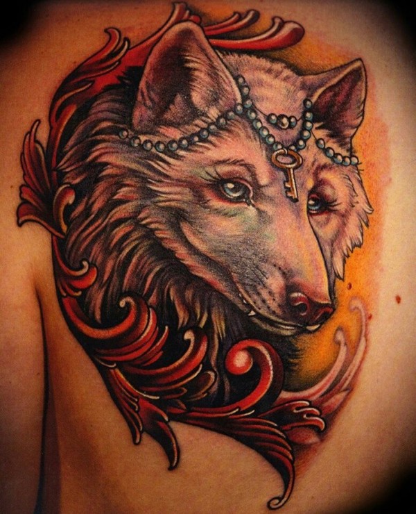 背部精彩的彩色狐狸与金钥匙纹身图案