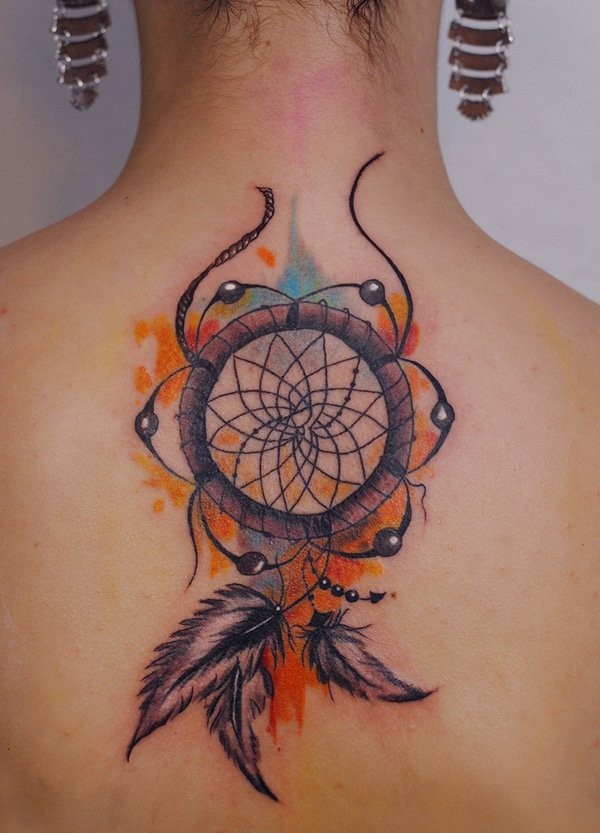 背部印度风捕梦网个五颜六色泼墨纹身图案