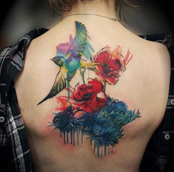 背部壮观的水彩风格彩色鸟与花朵纹身图案