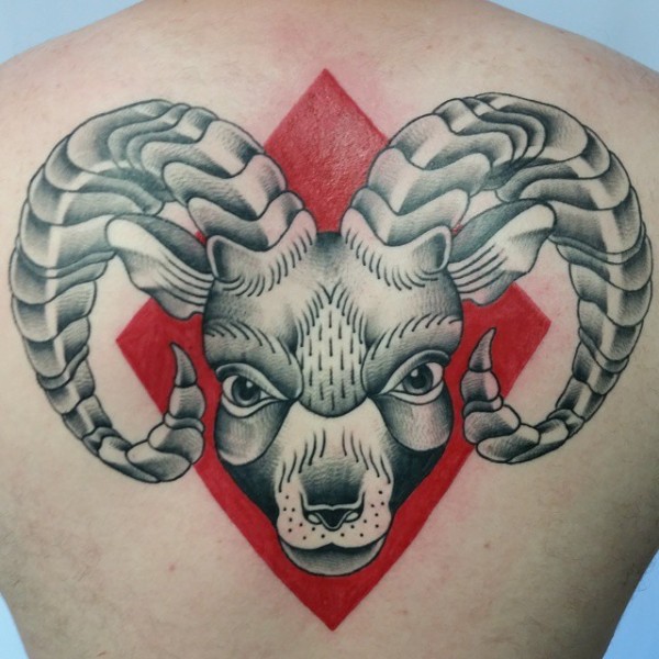 背部有趣的卡通彩色山羊头纹身图案