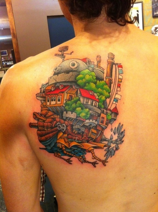 背部独特的彩色卡通风格幻想飞行船纹身图案