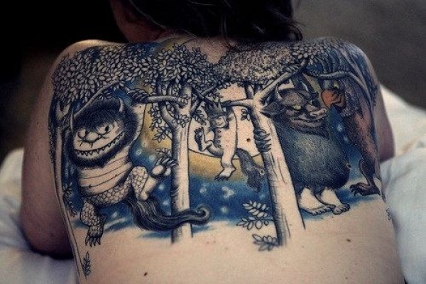 背部彩色的幻想生物与树木纹身图案