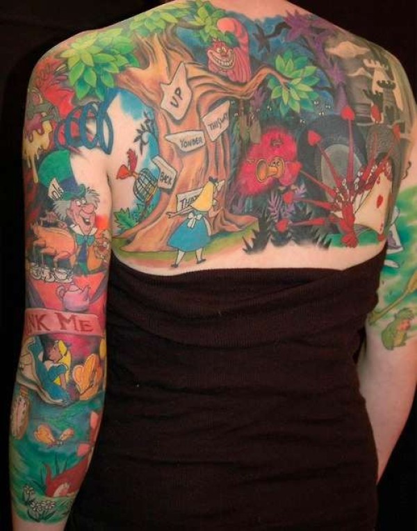 背部彩色的爱丽丝梦游仙境卡通纹身图案
