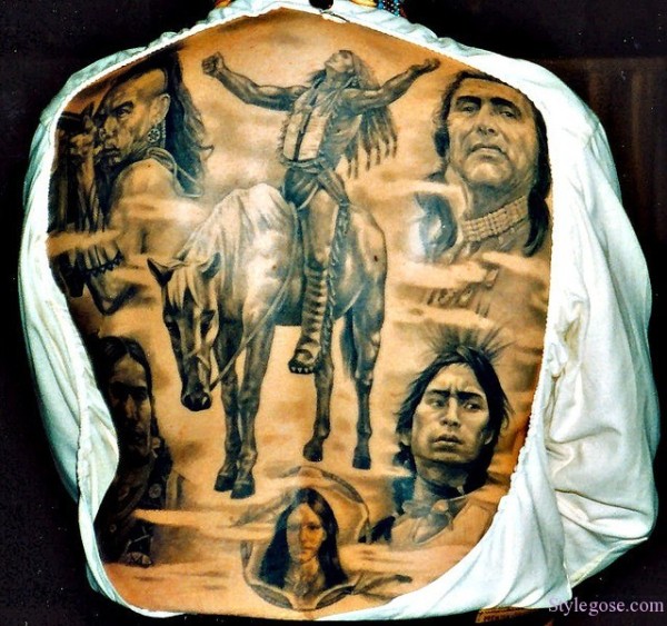 背部巨大的黑白各种印第安人纹身图案