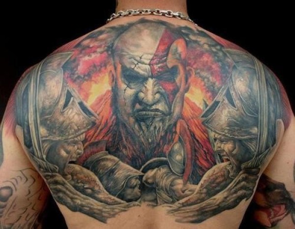 背部令人难以置信的彩色野蛮人战士纹身图案