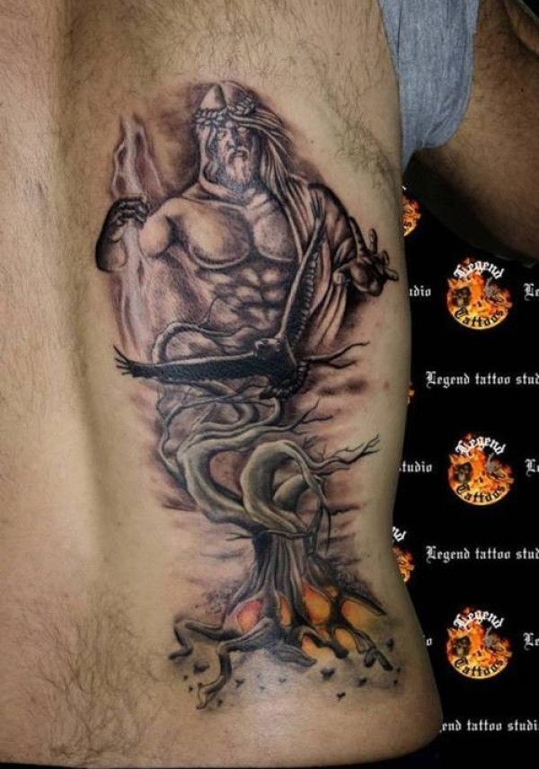 背部简单彩绘宙斯与树和乌鸦纹身图案