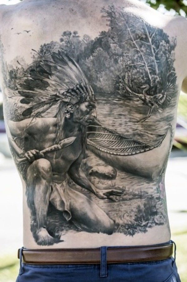 背部惊人美丽的黑色印度猎人与森林纹身图案