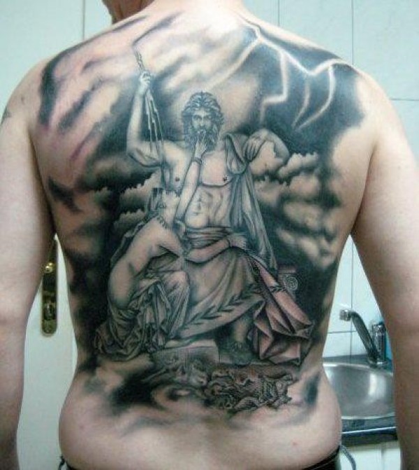 背部惊人的黑白闪电神像纹身图案