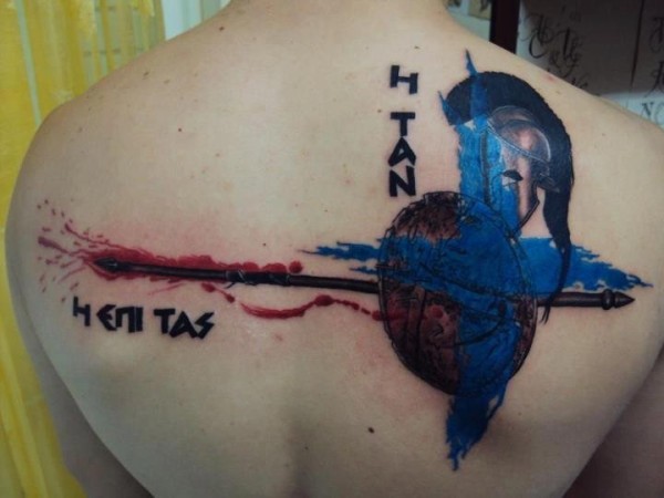 背部斯巴达的盾牌与头盔彩色泼墨纹身图案