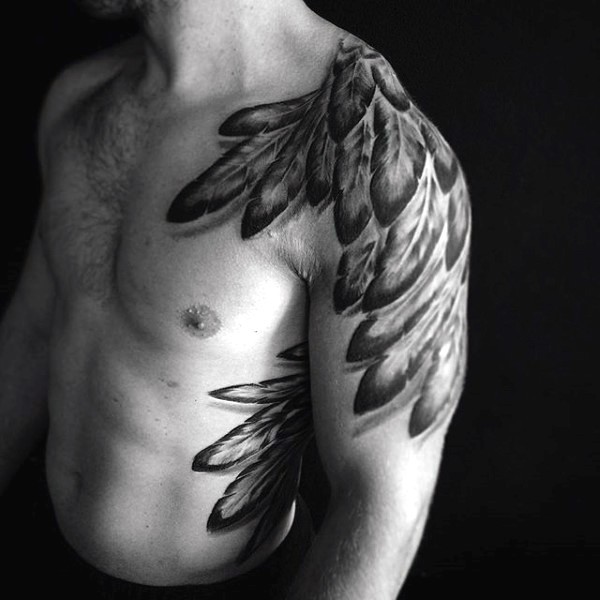肩膀和背部黑白的翅膀羽毛纹身图案