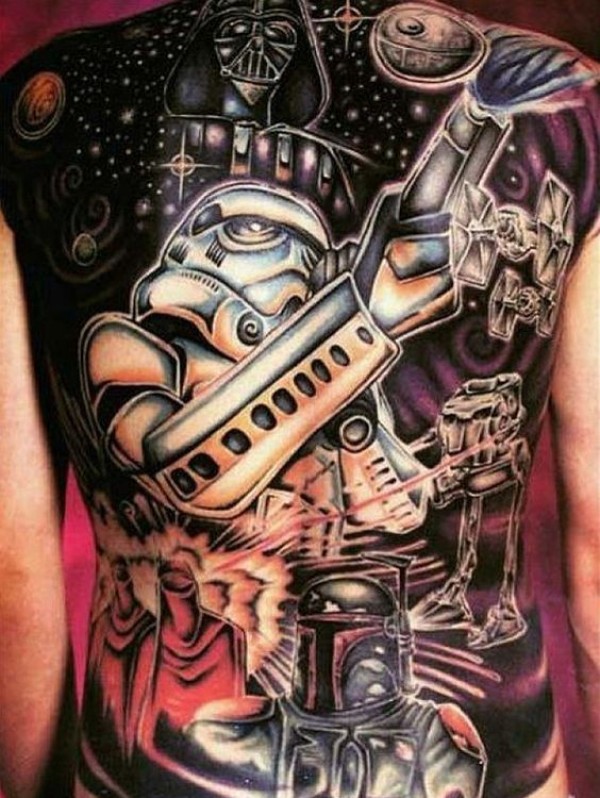背部很酷的星球大战主题与各种英雄纹身图案