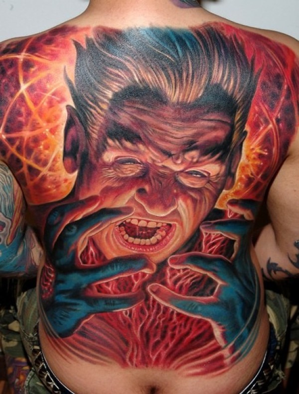背部不可思议的五彩邪恶巫师纹身图案