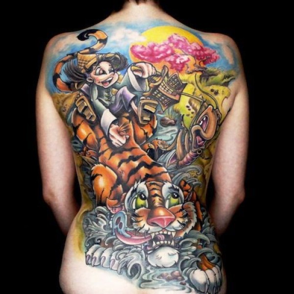 背部华丽的彩色卡通各种动物和小男孩纹身图案