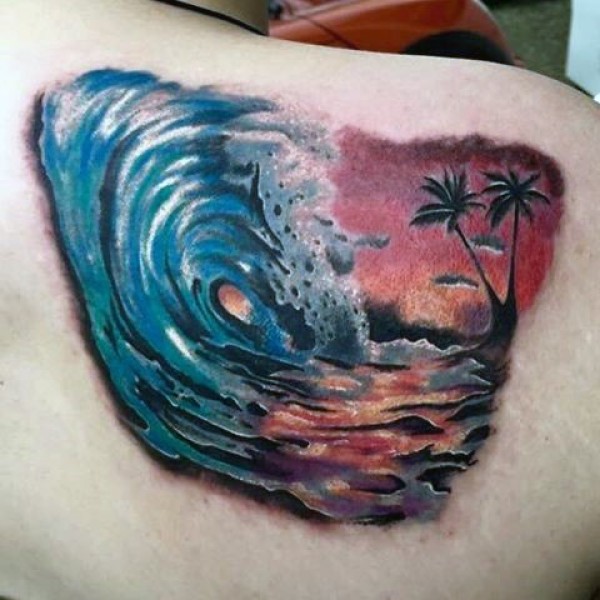 背部彩色的波浪与棕榈树纹身图案