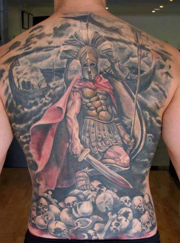 背部华丽的多彩斯巴达战士船和骷髅纹身图案