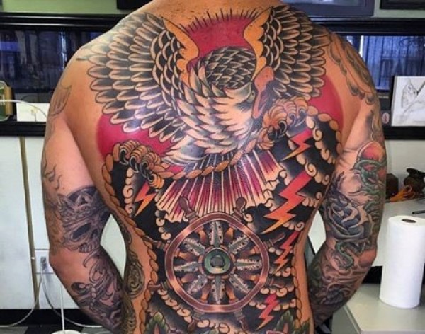 背部精彩的航海主题鹰和船舵纹身图案