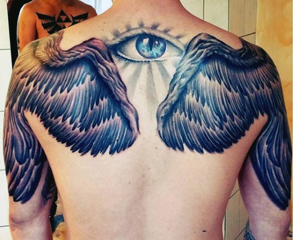 肩部和背部眼睛与乌鸦翅膀纹身图案